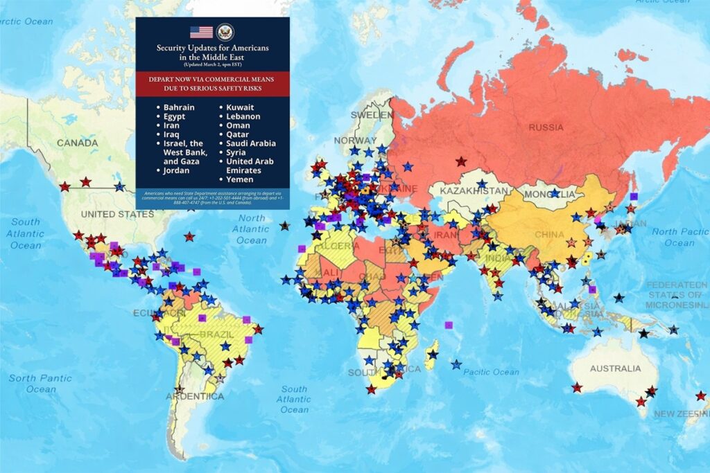 La escalada tras operaciones militares estadounidenses e israelíes contra Irán detonó una reacción inmediata en la política de alertas. Se instó a los ciudadanos a abandonar de inmediato más de una docena de países, incluyendo Bahréin, Egipto, Irán, Iraq, Israel, Cisjordania y Gaza, Jordania, Kuwait, Líbano, Omán, Qatar, Arabia Saudita, Siria, Emiratos Árabes Unidos y Yemen. La instrucción fue salir utilizando transporte comercial disponible. Sin embargo, esa disponibilidad es relativa.